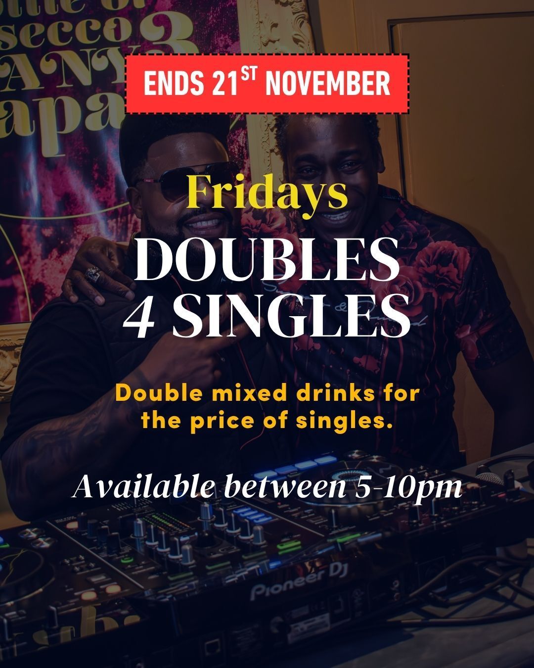 Come in for Doubles for Singles before the 21st November and 2 Cocktails for £12 before the 22nd Nov.